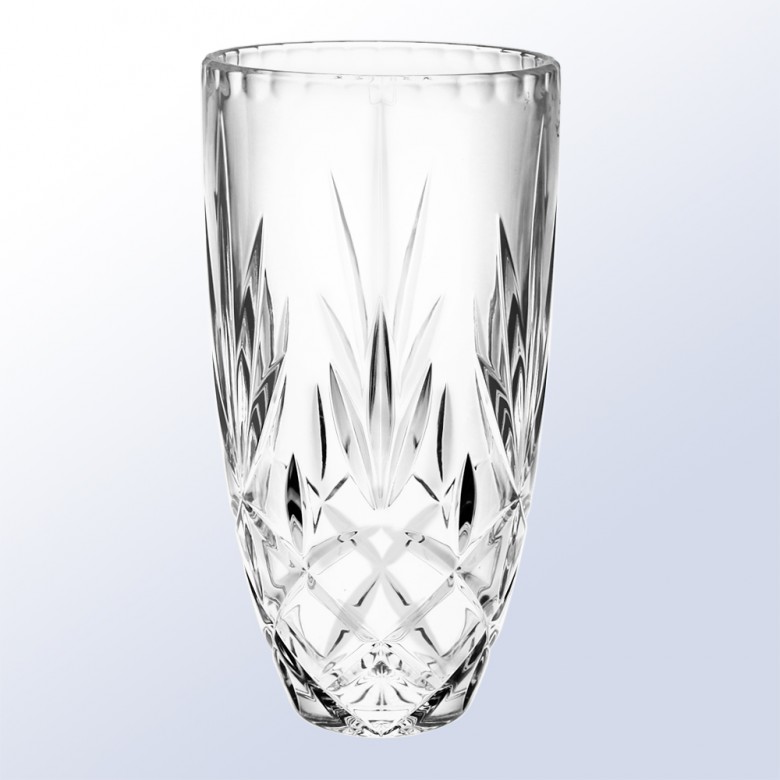 A graceful round crystal vase that makes a sophisticated custom gift for commemorative and executive recognition.