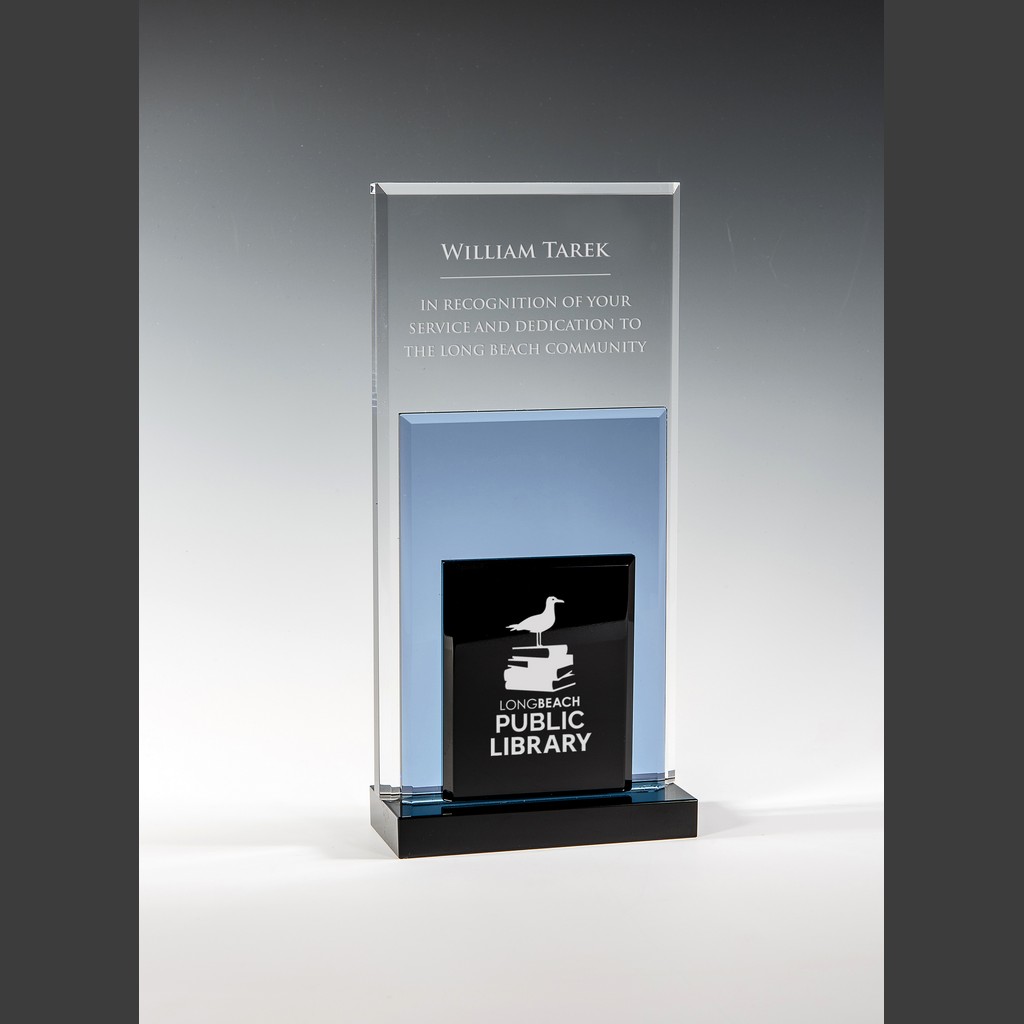 A striking colorful crystal award with a unique modern design for memorable corporate recognition.