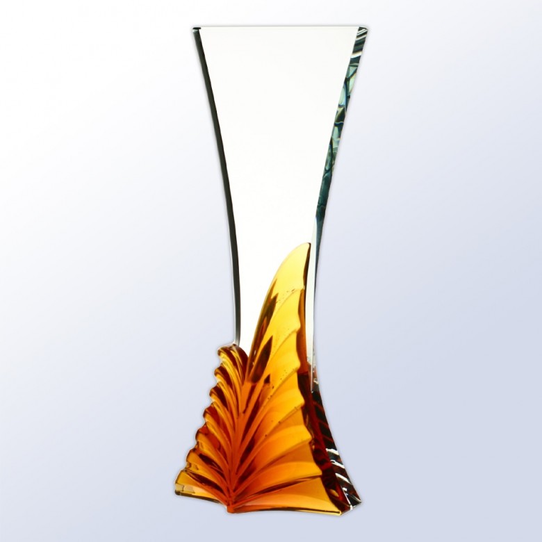 The Flourish Amber art glass award is handcrafted from Starfire glass using the pâte de verre technique, producing a warm amber tone and sculptural artistic design.