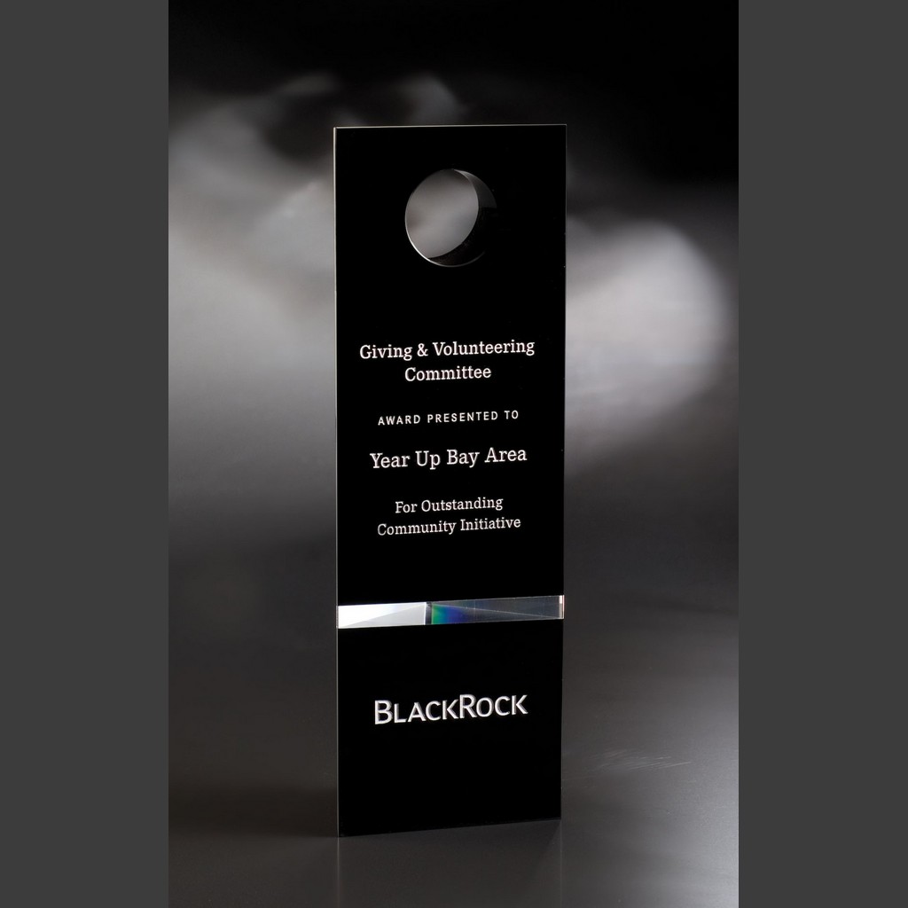 An uplifting colorful crystal award with an open modern design that symbolizes achievement and possibility.