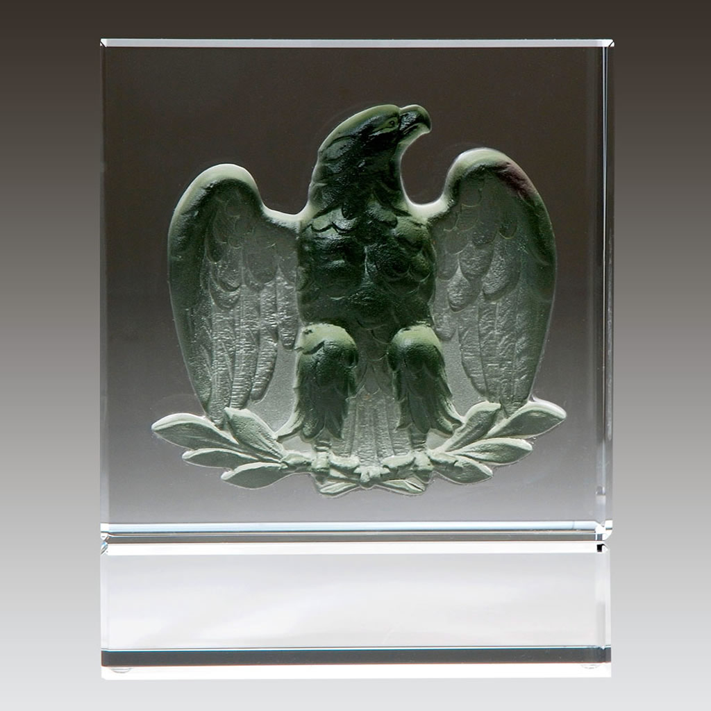 The Majestic Eagle Award in pewter combines optical crystal clarity with a sculpted Pate de Verre art glass eagle. This artistic award represents focus, authority, and achievement in corporate recognition settings.