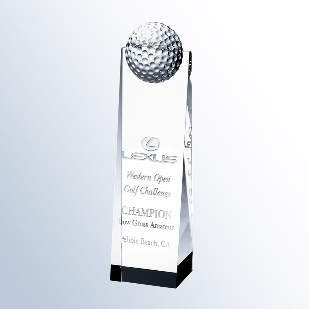 Crafted from premium optical crystal, this modern design features a golf ball-inspired tower silhouette with engraving potential on the base.