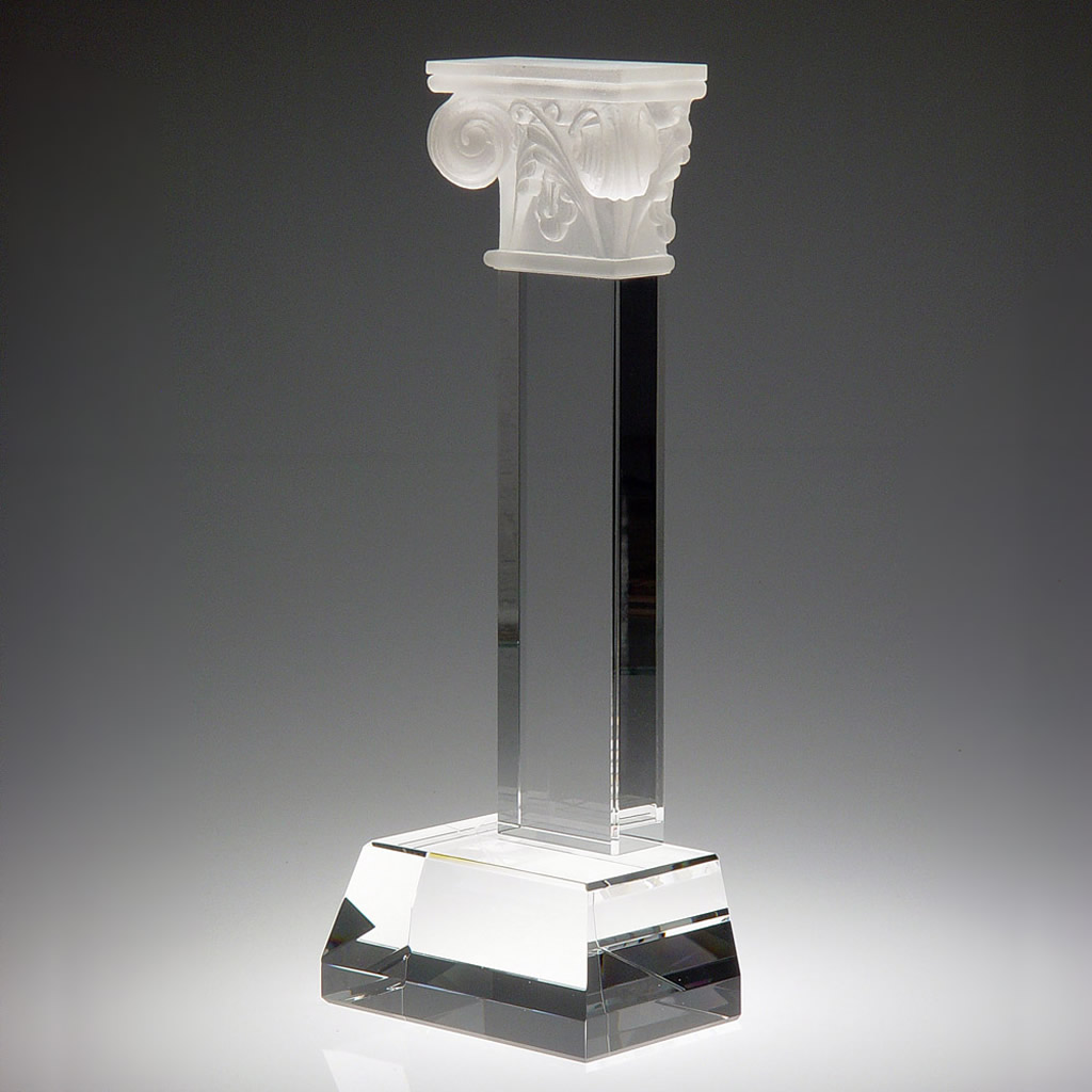 The Pillar of Success Award blends optical crystal clarity with a Pate de Verre art glass accent to create a refined artistic award for high-level corporate recognition. Its strong vertical design represents stability, leadership, and continued growth.