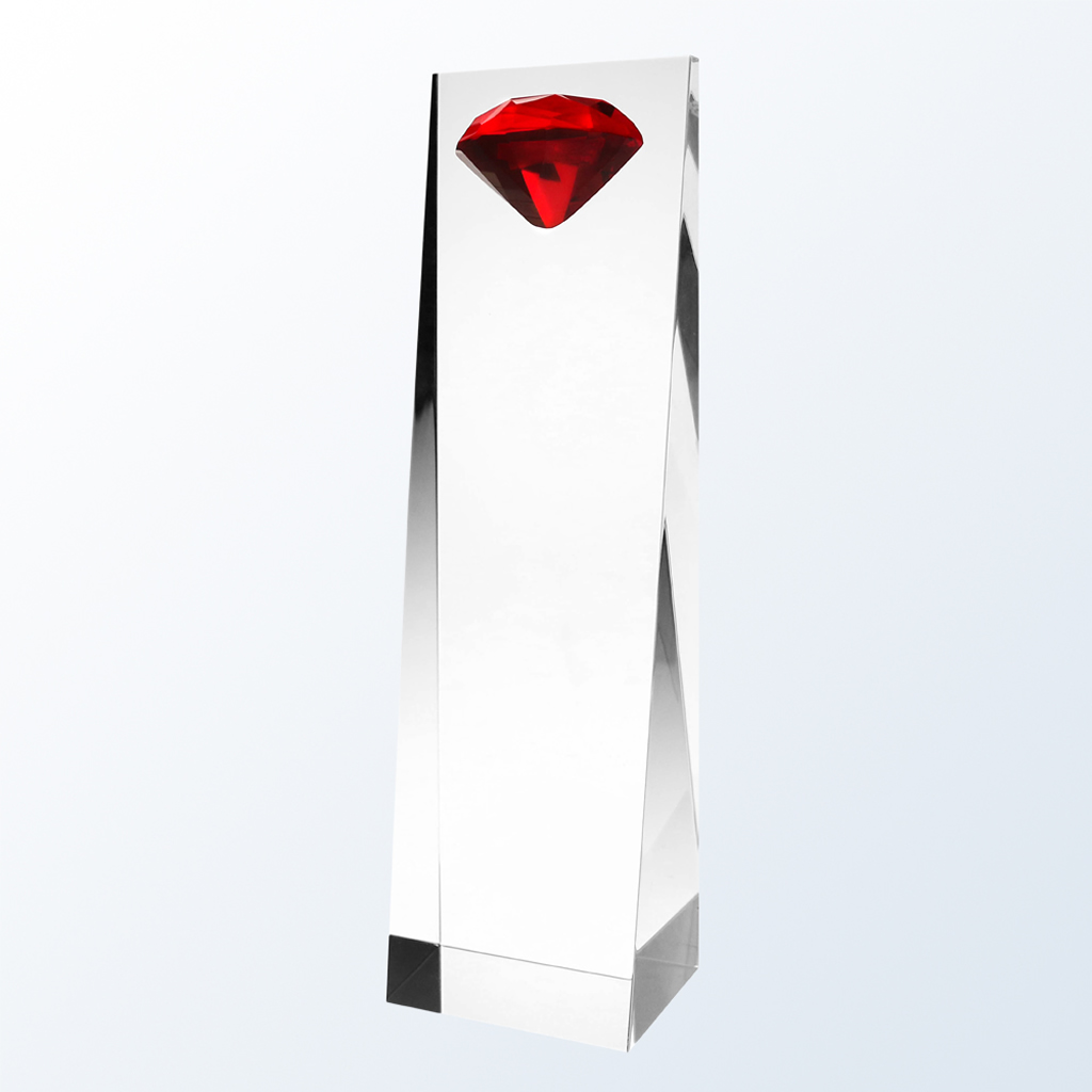 The Red Diamond Tower Crystal Award stands tall with commanding presence and flame-inspired styling. Its vertical faceted design and rich red accent embody leadership achievement and forward momentum.