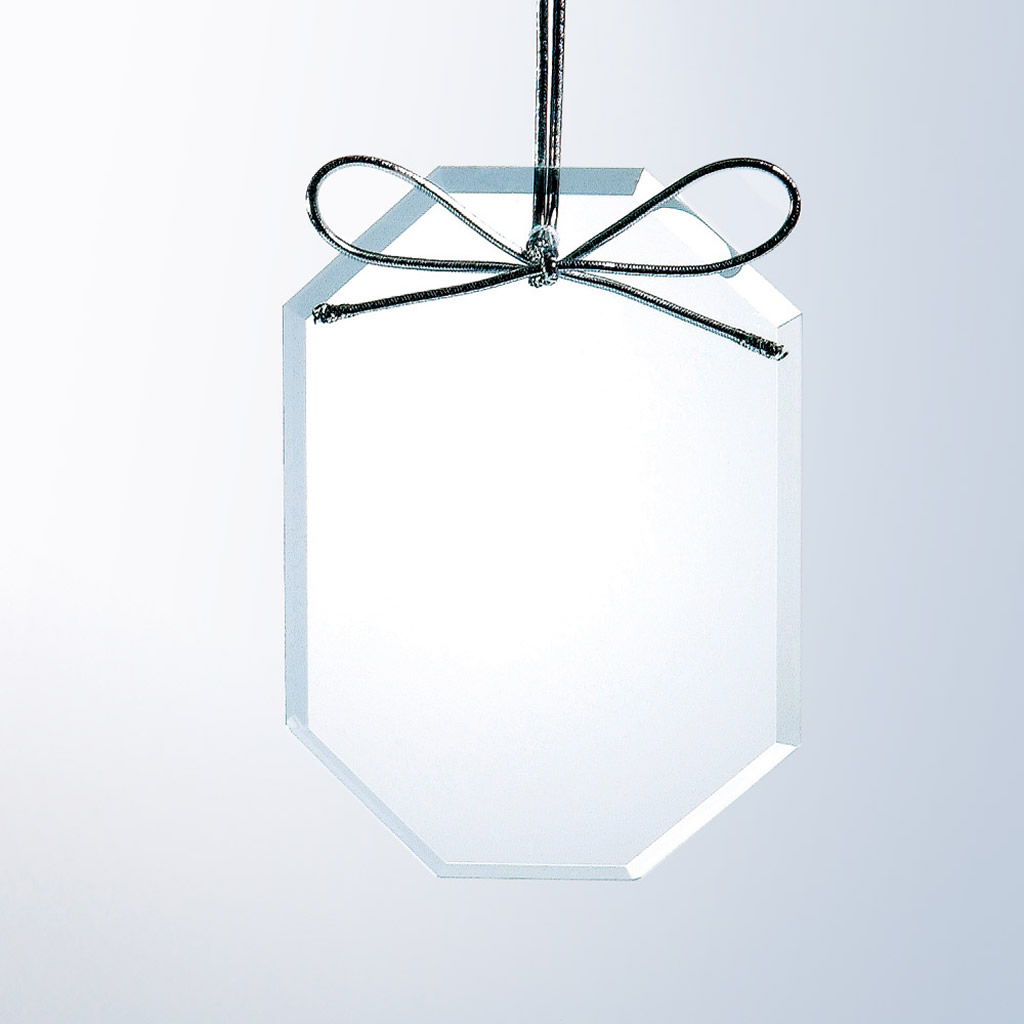 A sleek long-octagon Starfire glass ornament with a subtle blue tint, perfect for engraved holiday recognition and corporate gifting.